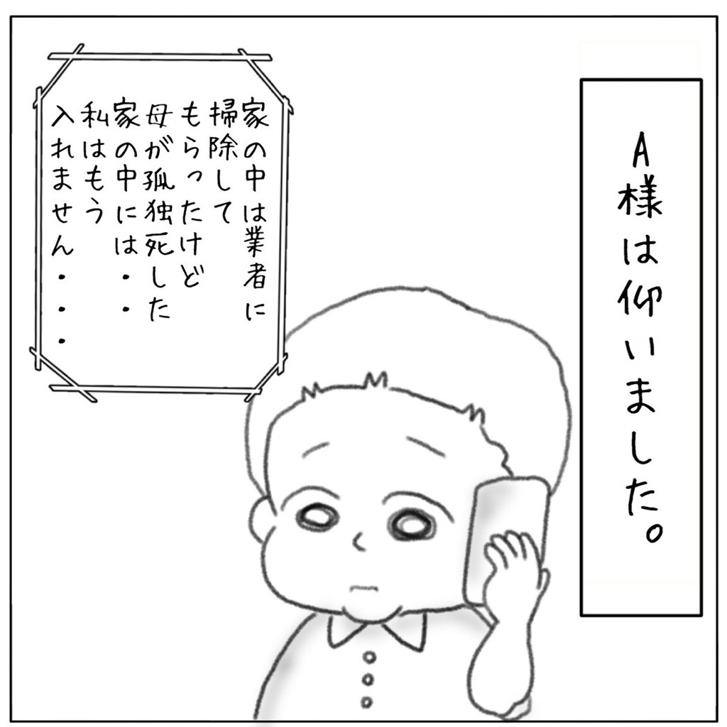 コラム - 事故物件成仏請負人 【まんが】20代でみた母の孤独死① 2023年5月22日 成仏不動産に入社して3年目のとある夏の日、営業マンに一本の電話がありました。 お問い合わせ内容は、お母さまが孤独死されたとのこと。 物件査定のために、物件に向かうと・・・ 事故物件のお役立ちコラム一覧に戻る